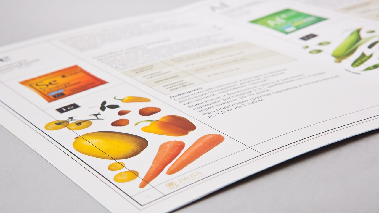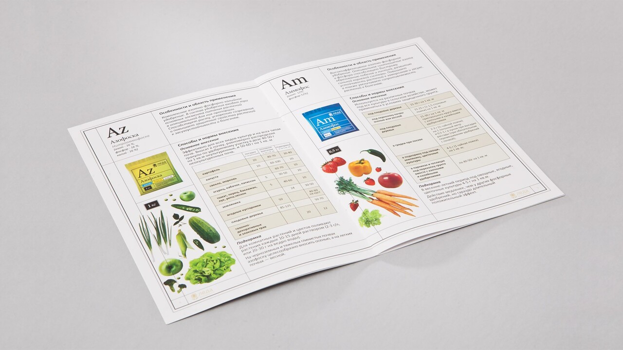 ВОПЛОЩЕНИЕ: Разработанный ранее дизайн упаковок удобрений послужил основой для общей концепции оформления буклета: куда поместить химические элементы, кроме как в периодическую таблицу уважаемого Дмитрия Ивановича Менделеева? Рамки и таблицы прекрасно организуют информацию, добавляют систематичность и точность – то, без чего невозможно обойтись в сельском хозяйстве, а изображения овощей и фруктов, гармонирующих по цвету с упаковкой удобрений, позволяют расставить цветовые акценты на каждой странице буклета.