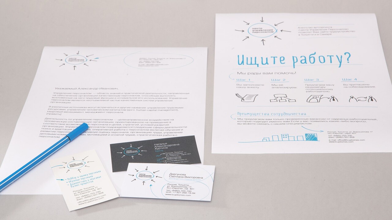 ЗАДАЧА: Центр управления персоналом (ЦУП) занимается аутсорсингом, трудоустройством, подбором и обучением персонала для самых разных компаний и предприятий. Руководители центра обратились к нам с просьбой провести рестайлинг и разработать новые фирменный блок и фирменный стиль.
