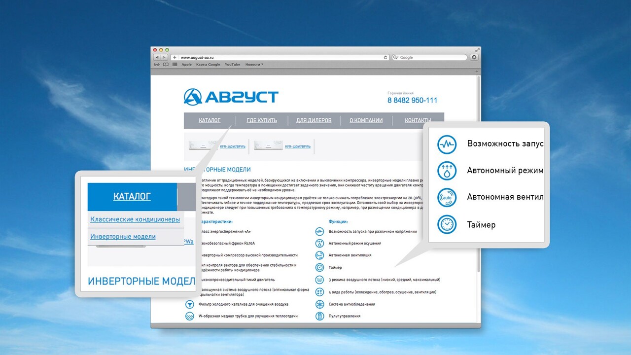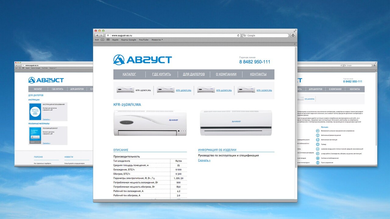 ВОПЛОЩЕНИЕ: Сайт соединил в себе информативность, легкость навигации и узнаваемые элементы рекламной кампании. Необходимый минимум графики и структурированная вёрстка наполняют сайт воздухом и простором; фирменное цветовое решение (синий, серый и серо-голубой цвета) создаёт ощущение спокойной прохлады. Каждый посетитель может с легкостью разобраться в многообразии представленной техники, а также познакомиться с нюансами, которые помогут выбрать наиболее подходящий кондиционер.