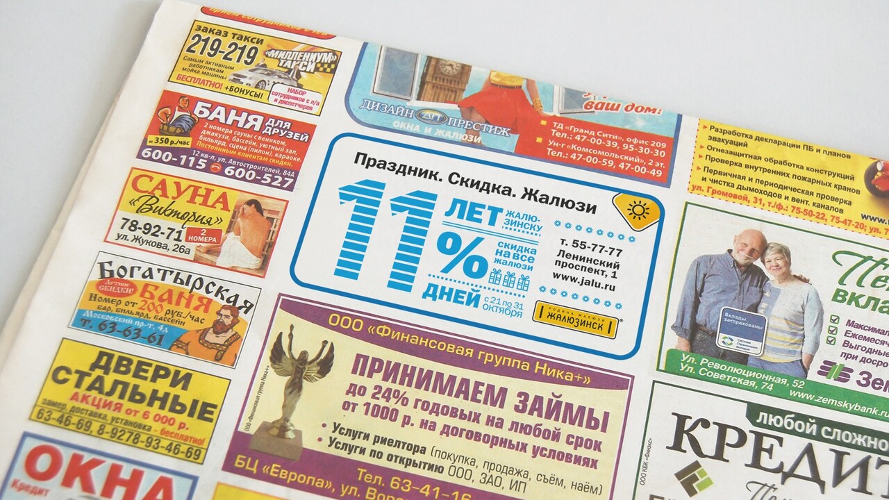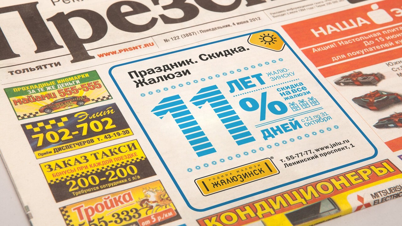РЕШЕНИЕ: К рекламному модулю взгляд читателя привлекают большие цифры «11», собранные, будто из горизонтальных полосок жалюзи. Условия акции обыгрываются за счет главного графического элемента, и это позволяет не перегружать композицию. Информация второго уровня дополняется визуальными объектами для лучшей передачи сообщения. В рекламную кампанию для «Жалюзинска» помимо модуля входят аудиоролик и наклейки на придорожные баннеры.
