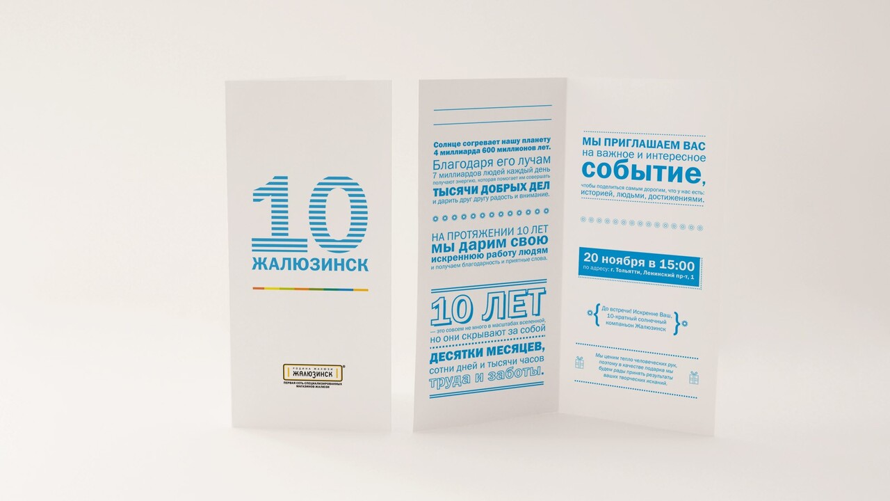 РЕШЕНИЕ: Воздушно-солнечный фирменный дизайн «Жалюзинска» разворачивается на пригласительных открытках. Юбилейная дата с гордостью демонстрирует возраст компании-именинницы. Горизонтальные полосы, из которых соткано число, символизируют любимое дело солнечного компаньона (жалю-творчество) и продукцию, которая в результате получается. Разворот каждого пригласительного складывается из воздушного облака тегов-фраз, в котором мы выделили главную информацию предстоящего события. Таким образом, текстовое поле превращается в своеобразный узор. Ничего лишнего, только самое важное.