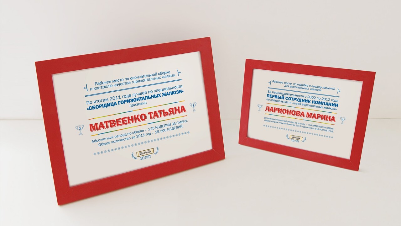Таблички для рабочих мест обзаводятся стилистикой наградных дипломов. Что, как не трудовые рекорды, может рассказать о сотрудниках лучше? «Жалюзинск» гордится своим коллективом – так на каждом макете возникают несколько говорящих за себя показателей, звания и имена «самых лучших» жалю-мастеров.
