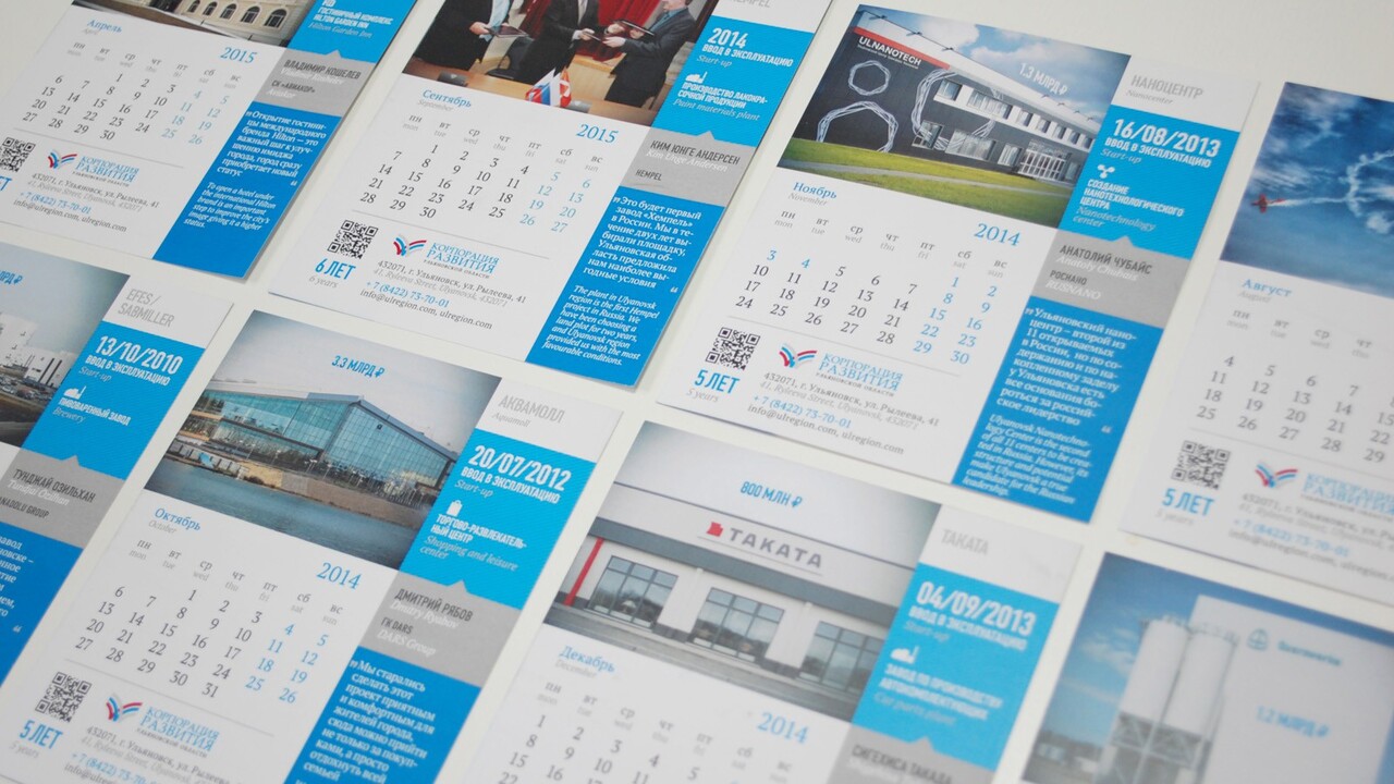 РЕШЕНИЕ: Инвестиционные победы, воплощенные в проекты, раскладываются по мини-календарям на месяц. Миниатюрный двусторонний календарный лист включает в себя максимум информации о каждом проекте: здесь и кейс об успехе, инвестиционные «параметры», цитаты из уст участников и фотография, которую «лучше 100 раз увидеть», а также техническая прогрессивность, проявляющаяся в QR-коде с отсылкой к сайту. Фирменная цветовая гамма и динамичная фоновая штриховка – лучшая униформа для столь насыщенного событиями, открытиями и информацией календаря.