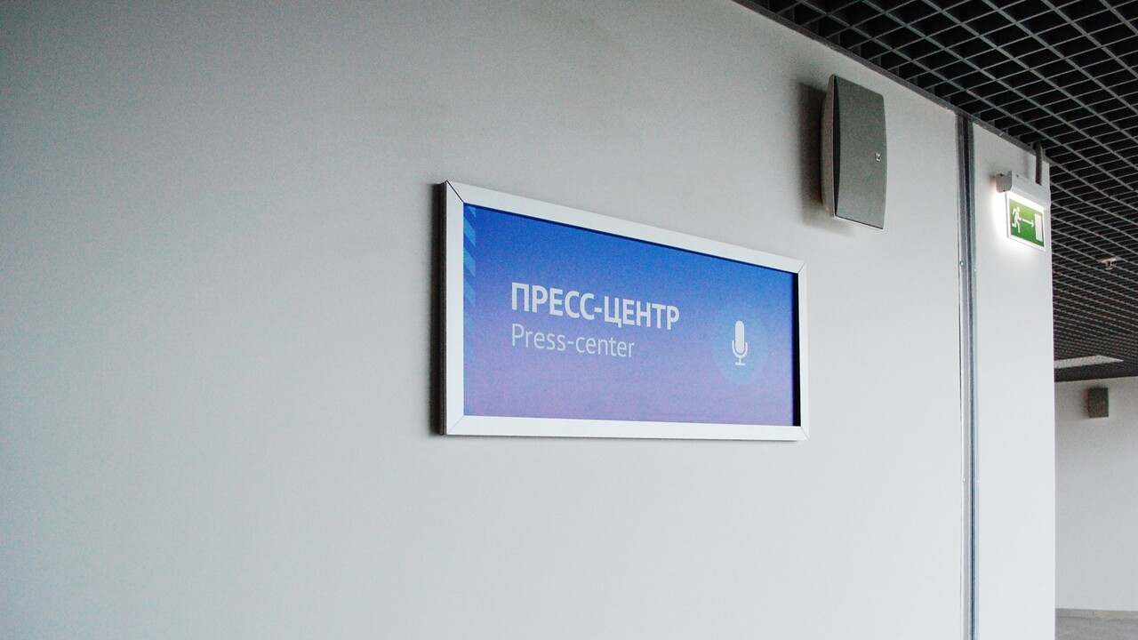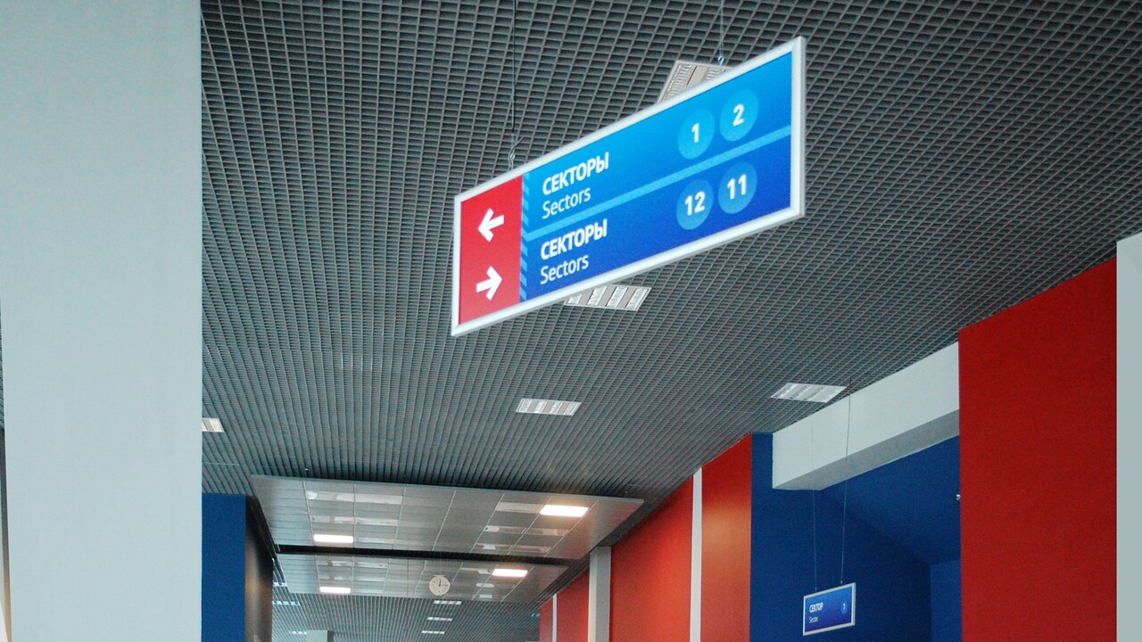 РЕШЕНИЕ: Два фирменных для ледового дворца цвета: жаркий красный и морозный синий расцвели на всех носителях. Разметка из полосок приобрела текстуру, напоминающую иней. Изображения-иконки, которые иллюстрируют маршруты для спешащих болельщиков, обосновались на указателях, прикрепленных к стенам и подвешенных к потолку. На стенах развернулись информационных площадки в виде табло с фирменными полосками и красной текстовой разметкой.