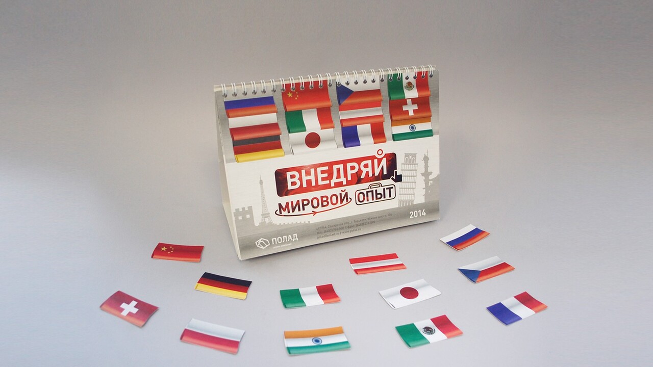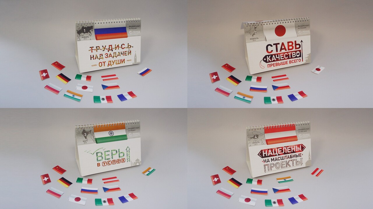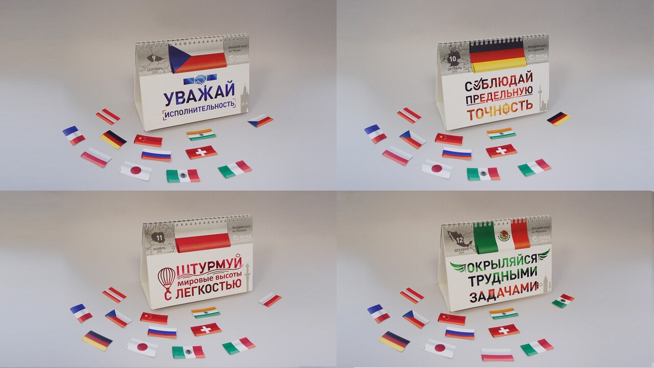 РЕШЕНИЕ: Компания постигает тонкую науку искусства управления и рассказывает об уже обретенном опыте. Географическо-культурный календарь каждый месяц повествует о конкретной стране, характере её жителей и тому, как этот характер помогает решать бизнес-задачи. Кастинг принципов и методик осуществлялся со всей строгостью, а их лаконичность не менее тщательно оттачивалась, для слоганов-фраз. Принципы менеджмента сформулированы как профессиональный кодекс и задачи сотрудника «Полад». Концепция развивается в типографической композиции, в которую емко закладываются смыслы текста. Каждая страница выполнена по композиционной схеме: географическое расположение страны-мудреца, её символ и флаг. Атмосфера технологичности и технической направленности работы компании достигается за счет стального серебристого фона. Квартальный календарь делится кредо компании на целый год и посылом для аудитории «Внедряй мировой опыт».