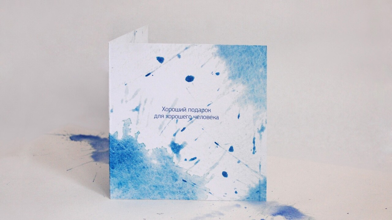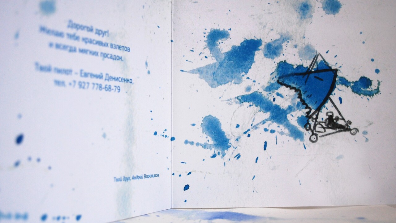 РЕШЕНИЕ: Основу упаковки для будущего эмоционального подарка составила акварельная зарисовка из капель, брызг и разводов, оставленных синей краской. Затем твердая и уверенна рука дизайнера обвела получившийся эскиз таким образом, что миру явился дельтаплан и его храбрый рулевой, который парит в акварельных облаках. Текстовое послание приобрело личный и теплый посыл, который, с одной стороны, желает яркого события, а с другой, применим в целом к жизни.