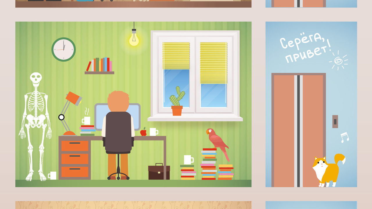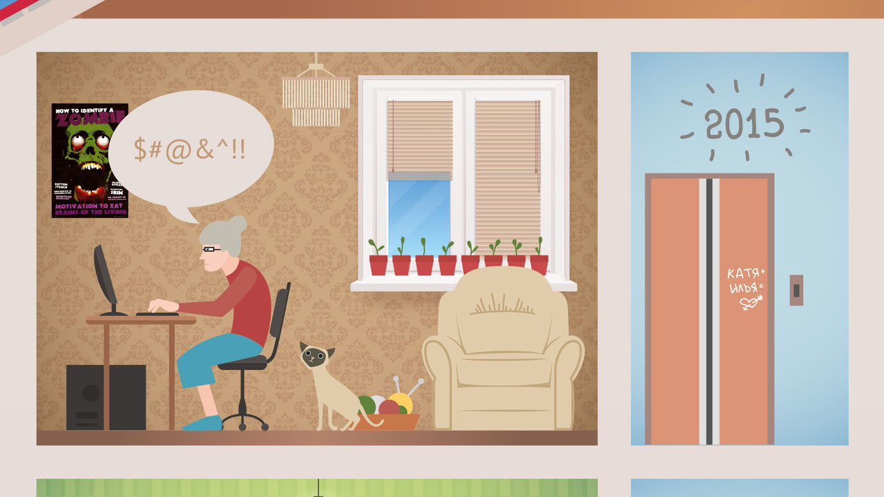 РЕШЕНИЕ: мы все разные, но жалюзи нужны нам всем. Отсюда — дом, жители которого занимаются своими повседневными делами. Каждое дело можно отметить в календаре. У каждого персонажа в квартире жалюзи.