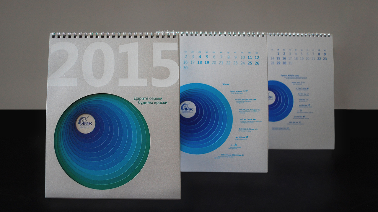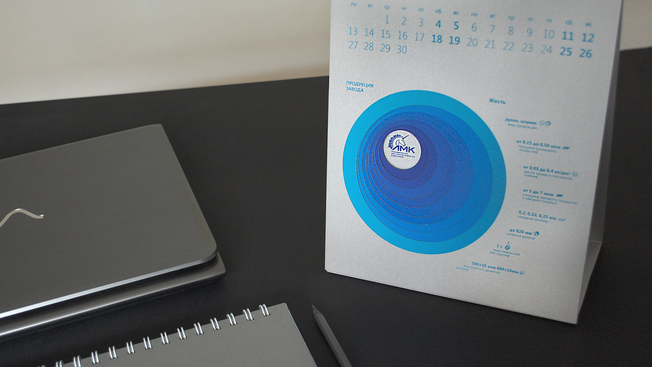 РЕШЕНИЕ: В основе визуального образа металлические трубы разного цвета и диаметра. Мы вставили их друг в друга и получили нечто среднее между порталом и детский пирамидкой. Лаконичный, но непростой календарь с вырубкой приятно листать и рассматривать.