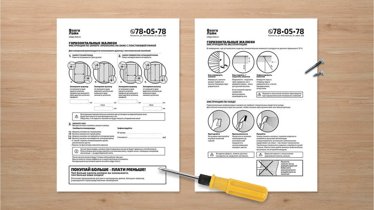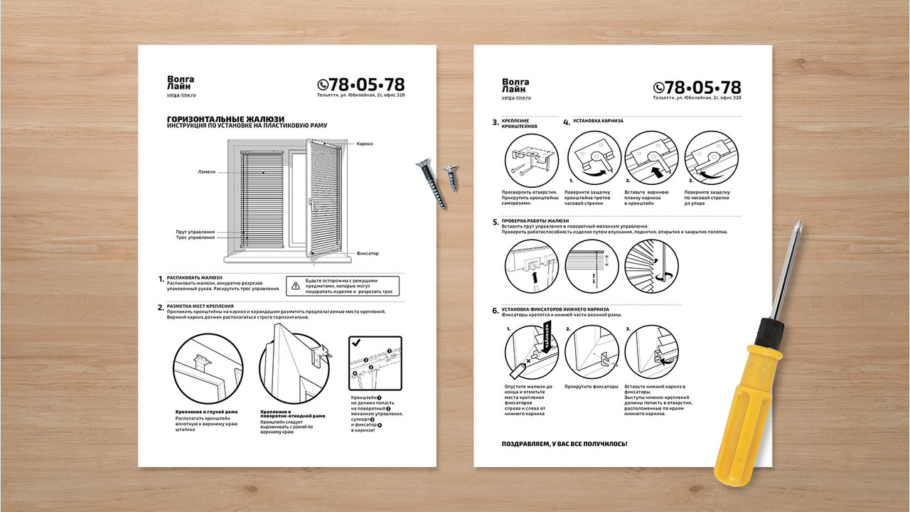 РЕШЕНИЕ: Особенность компании «ВолгаЛайн» в том, что каждый покупатель может сам сделать замеры и установить жалюзи. Для этого ему всего лишь воспользовавшись понятными инструкциями, разработанными командой «Творкен Мален».