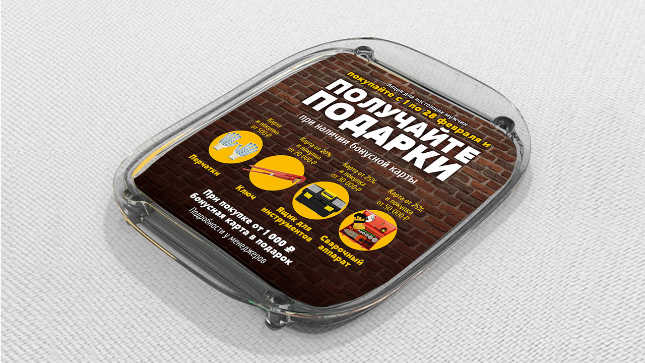 РЕШЕНИЕ: акция для настоящих мужчин – делайте покупки, получайте подарки! Брутальный плакат освещает акцию и иллюстрирует подарки. Макет транслируется на разные носители: плакат, баннер на сайт, монетницу и модуль на счет.